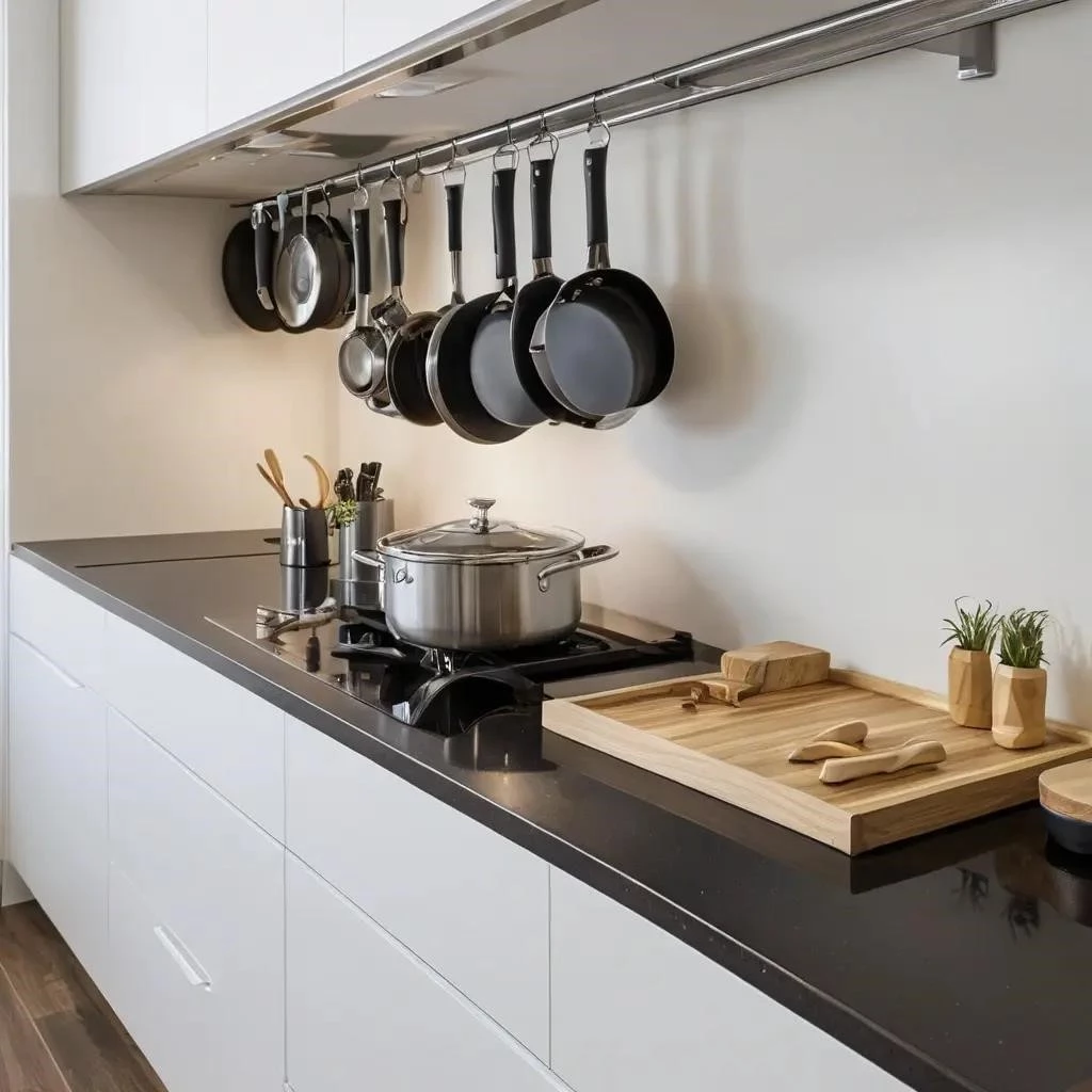 • Подвесные системы и рейлинги: Эти умные решения для кухни размещают кухонную посуду над островом или вдоль стены, улучшая функциональность кухни и эргономику.